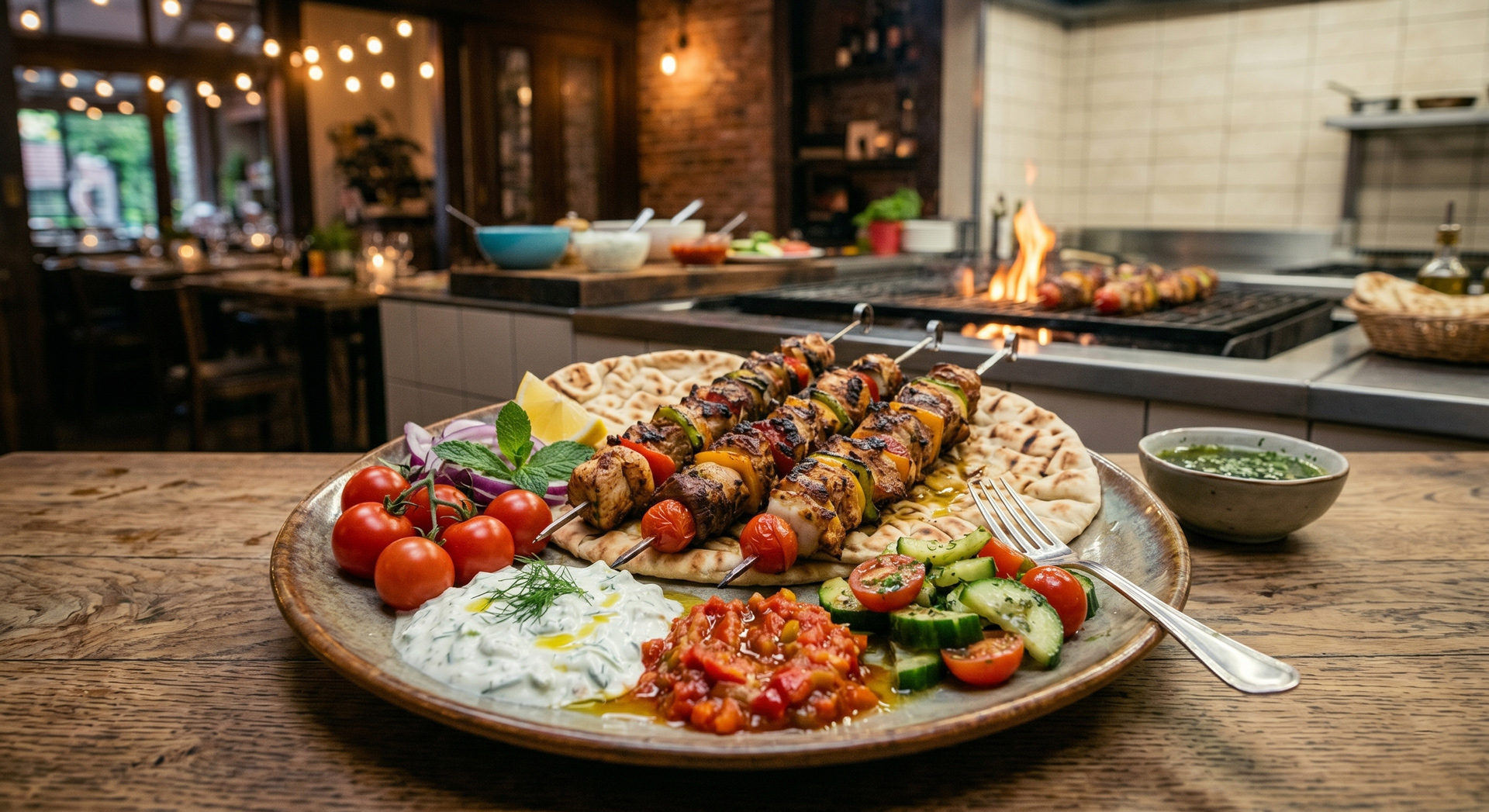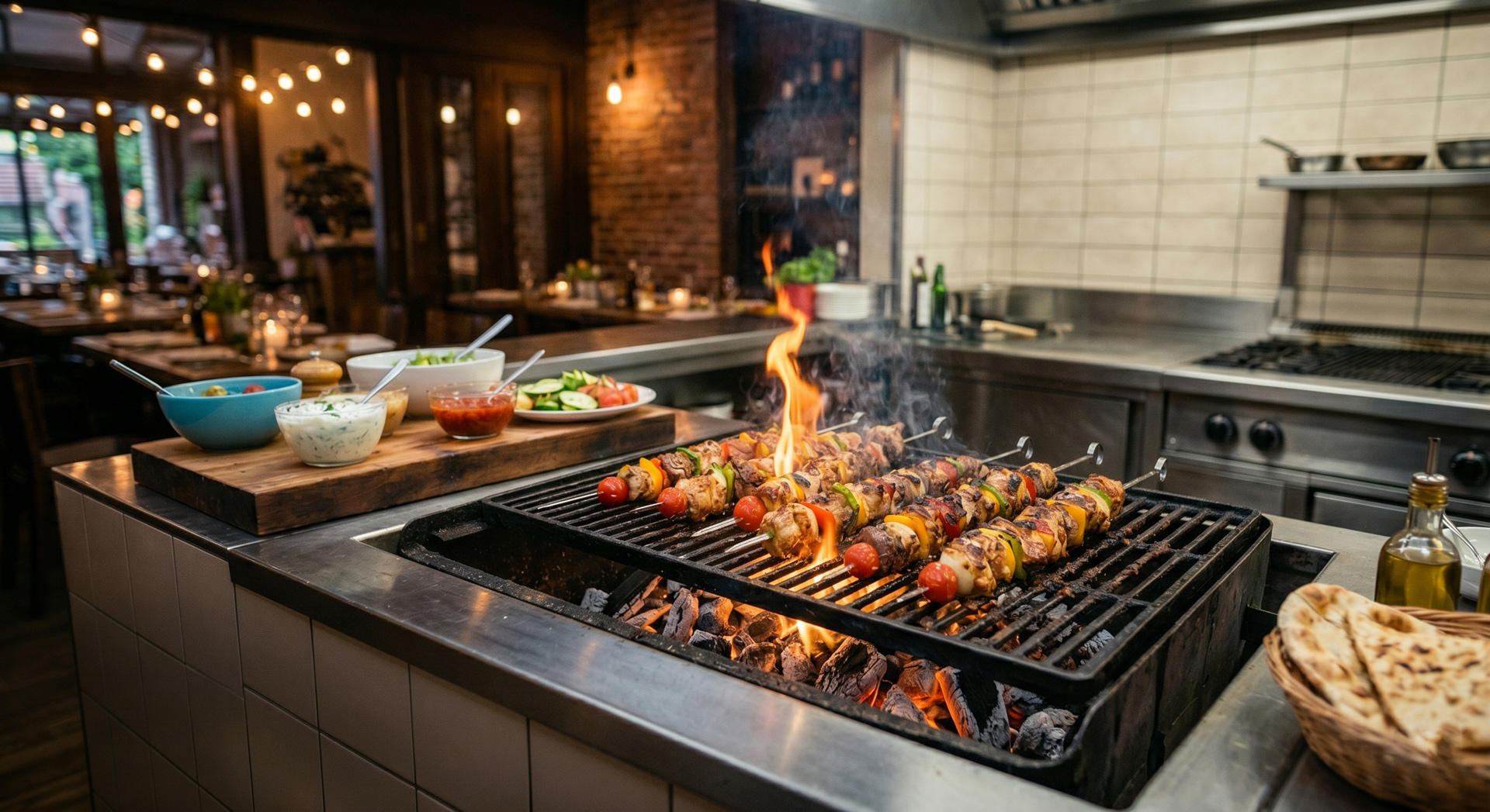 Kebab, jehněčí, kuřecí šíš tawok — na olivovém dřevěném uhlí. Hodiny přípravy, minuty na talíři.